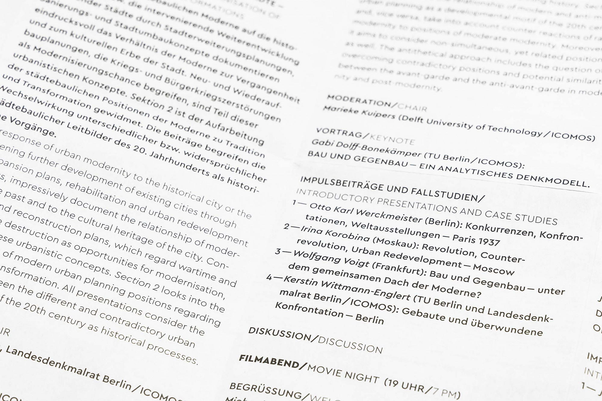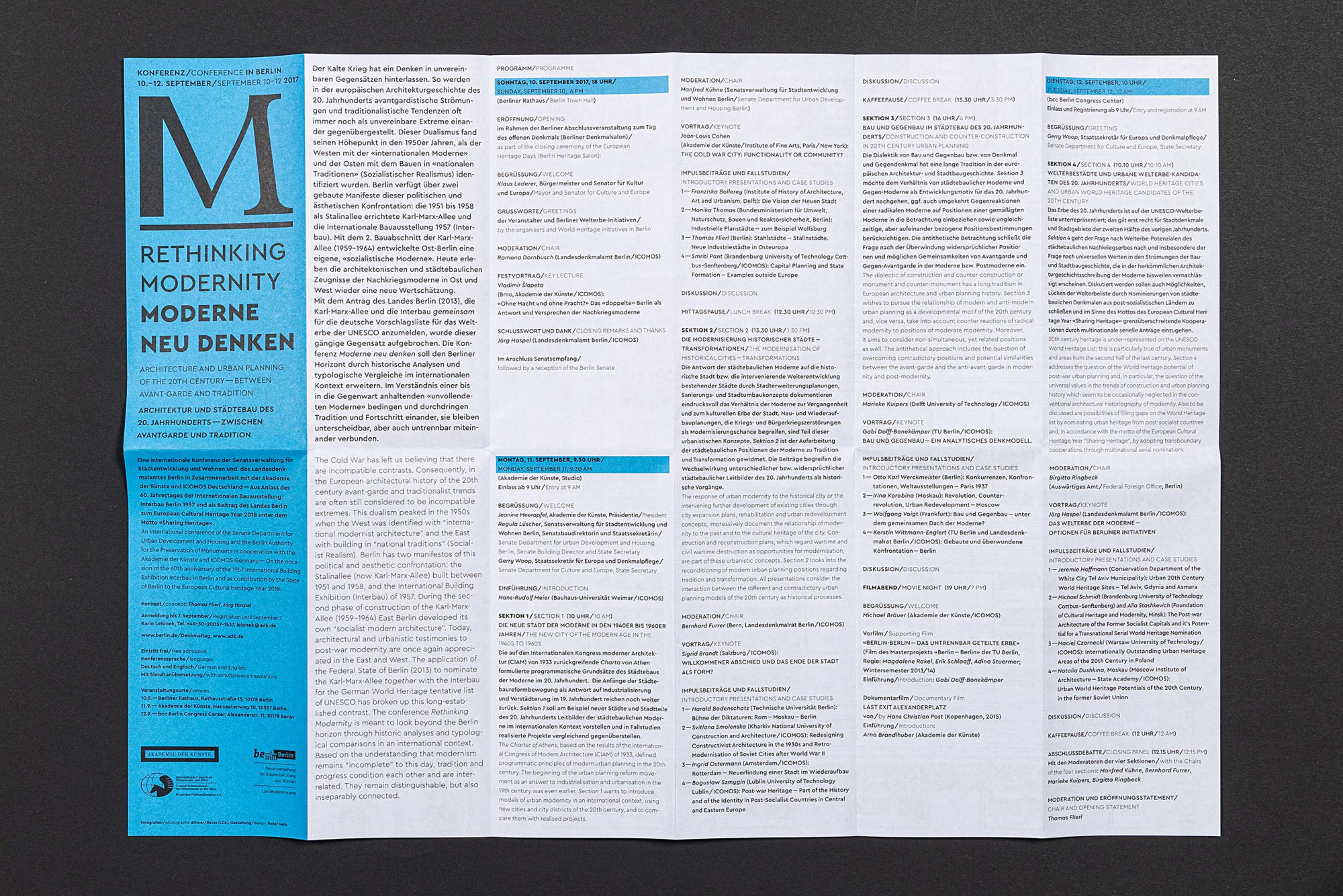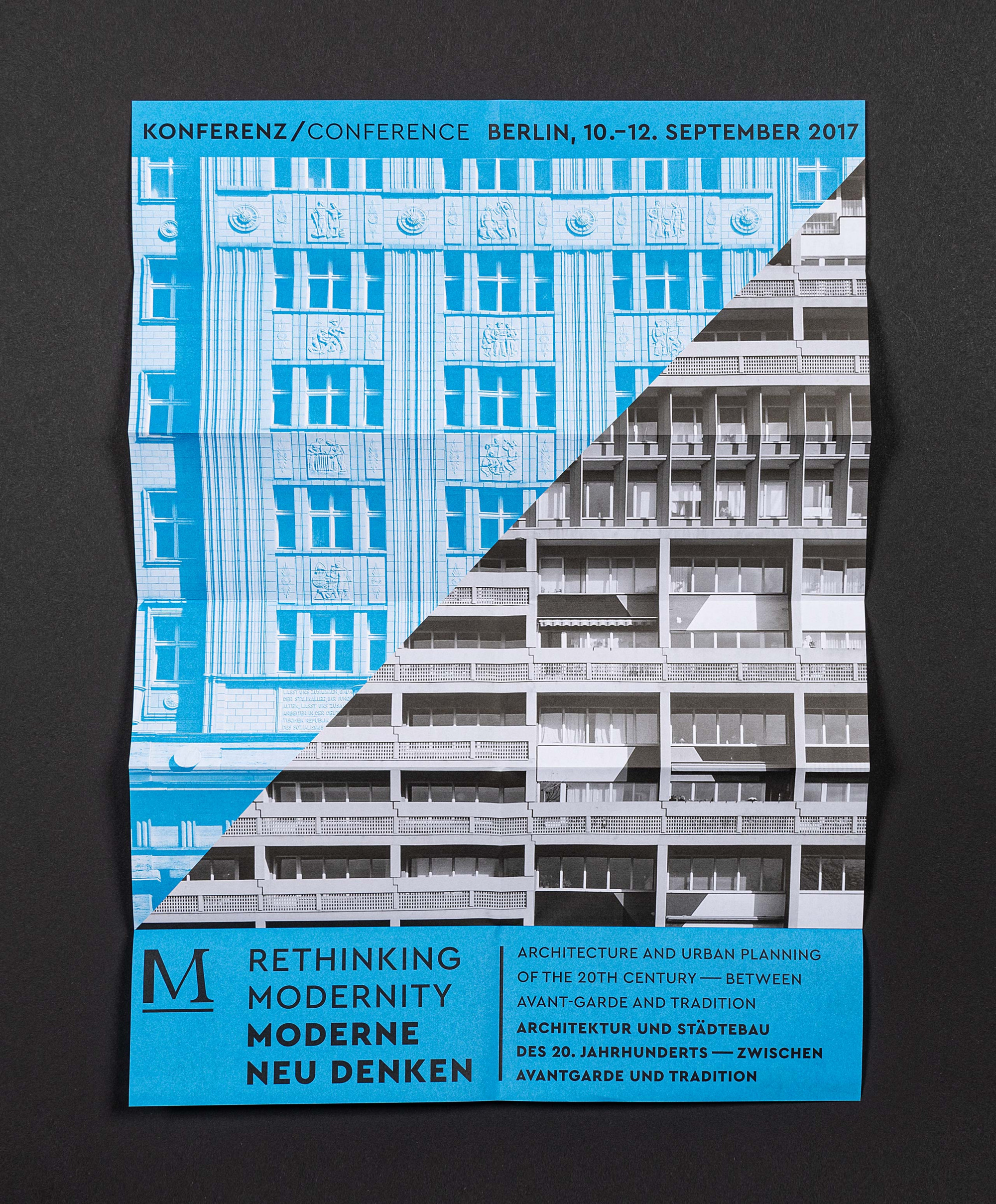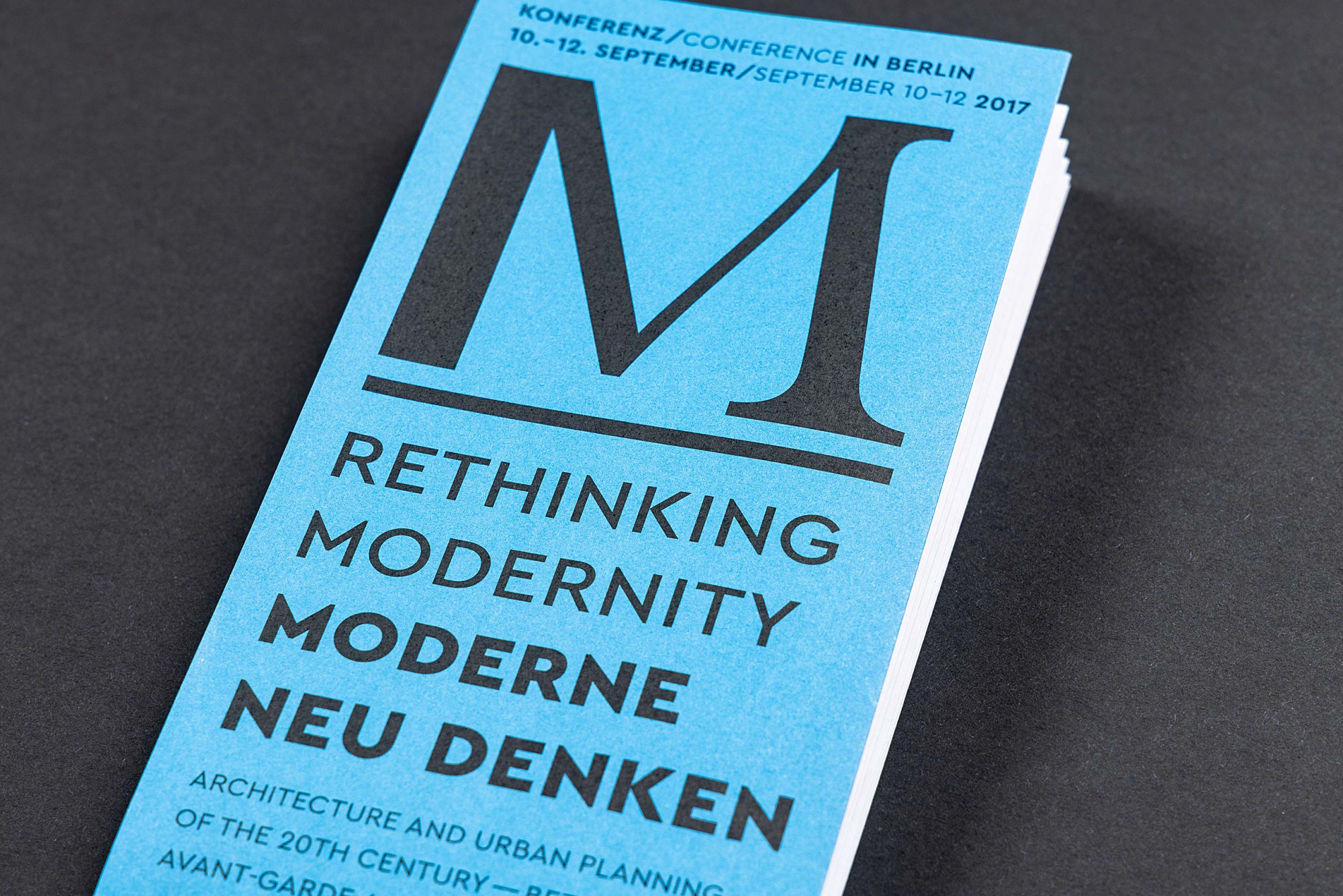 Erscheinungsbild für eine Architekturkonferenz an der Akademie der Künste Berlin, die sich mit dem bislang geteilten Erbe der Moderne in Ost und West befasst und für eine verstärkte gemeinsame Wahrnehmung der verschiedenen Stränge der Moderne plädiert. Ein versales M vereint als Logo Elemente einer klassizistischen Antiqua mit denen einer modernen Groteske und verweist gleichzeitig auf das architektonische Element der Stütze.